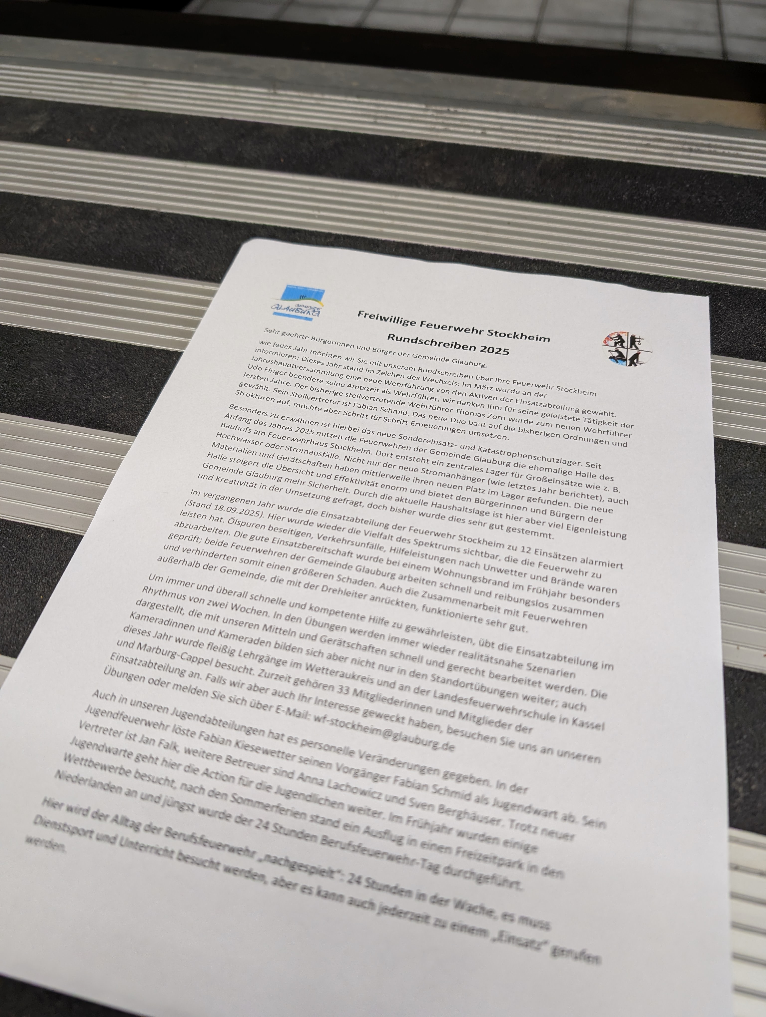 wie jedes Jahr möchten wir Sie mit unserem Rundschreiben über Ihre Feuerwehr Stockheim informieren: Dieses Jahr stand im Zeichen des Wechsels: Im März wurde an der Jahreshauptversammlung eine neue Wehrführung von den Aktiven der Einsatzabteilung gewählt. Udo Finger beendete seine Amtszeit als Wehrführer, wir danken ihm für seine geleistete Tätigkeit der letzten Jahre. Der bisherige stellvertretende Wehrführer Thomas Zorn wurde zum neuen Wehrführer gewählt. Sein Stellvertreter ist Fabian Schmid. Das neue Duo baut auf die bisherigen Ordnungen und Strukturen auf, möchte aber Schritt für Schritt Erneuerungen umsetzen.