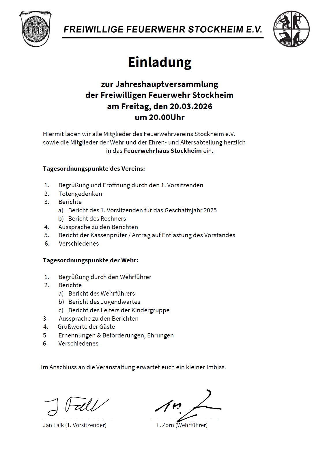 Einladung zur Jahreshauptversammlung der Freiwilligen Feuerwehr Stockheim am Freitag, den 20.03.2026 um 20.00 Uhr.