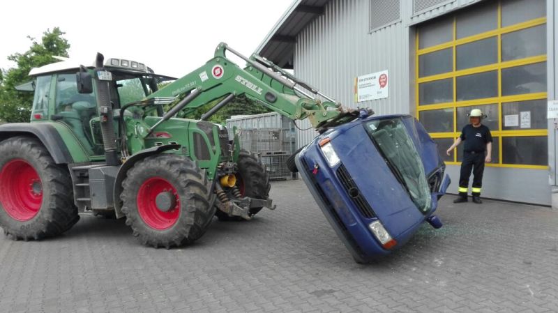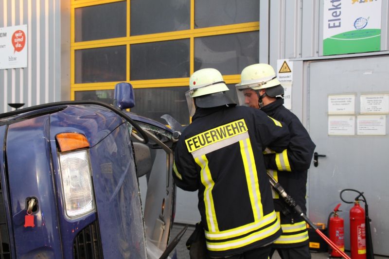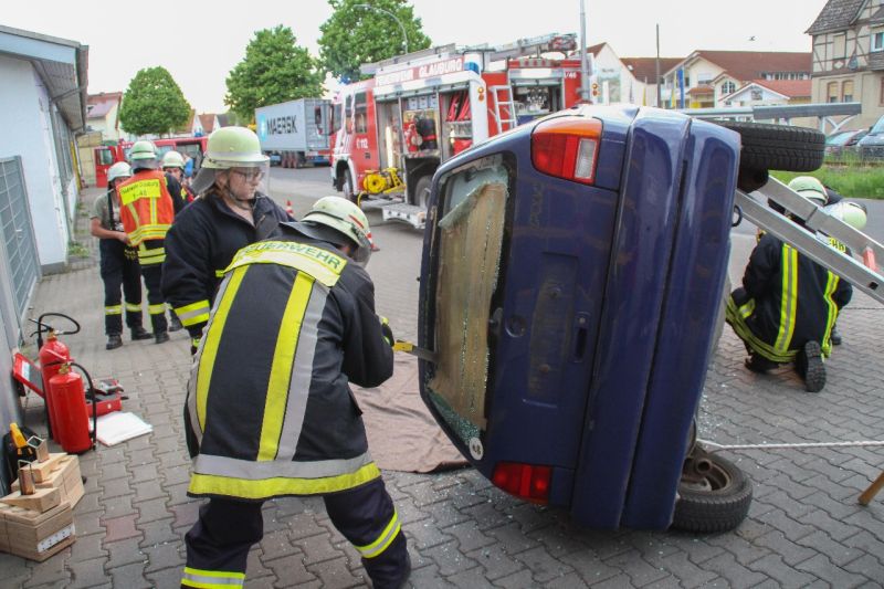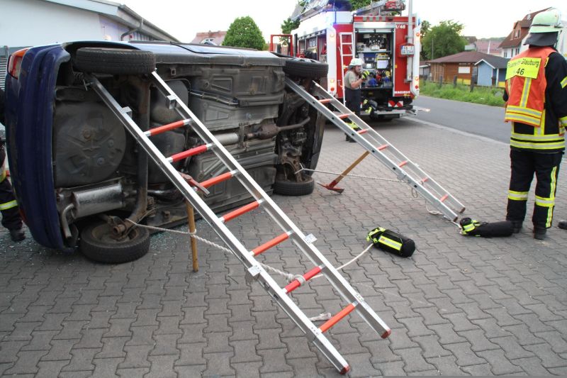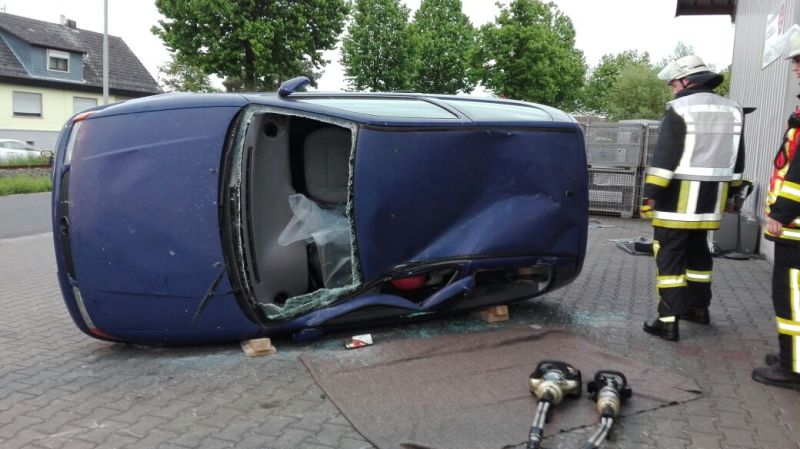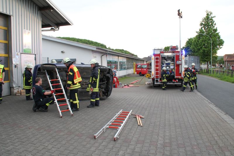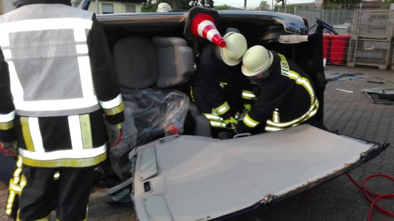Der erste Abend Ende Mai stand im Zeichen der praktischen Übung. Angenommen war das sich ein Fahrzeug ( Polo, Baujahr 1997 ) sich mehrmals überschlagen hat und auf der Seite liegen geblieben ist. Dabei ist der Beifahrer aus dem Auto geschleudert worden und der Fahrer lag eingeklemmt im Unfallfahrzeug.