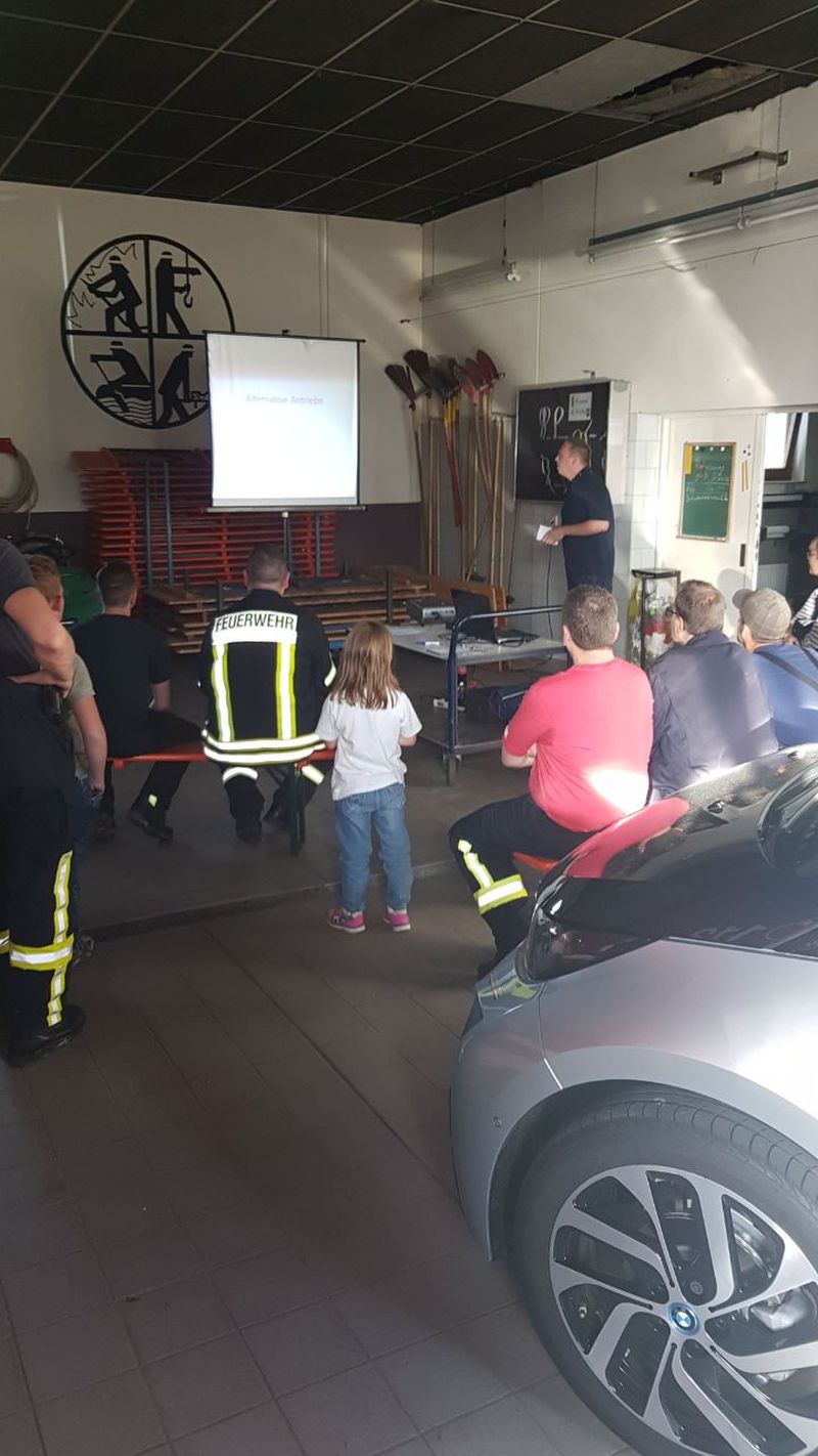 Der zweite Übungsabend in der ersten Juni Woche war ein abschließender Theorie - Teil. Hierbei ging Zorn auf die alternativen Antriebe ein. Nach der Erläuterung der „AUTO“ Regel für die Erkundung wurden die Gefahren von Flüssiggas-, Erdgas-, Hybrid- und Elektroantriebe erläutert. Hierbei wurde immer auf die Gefahren bei Bränden und Unfällen hingewiesen. Anschließend wurde ein BMW i3 vorgestellt und anhand dieses Fahrzeug genauer auf die Gefahren eingegangen. Auch die Themen Rettungskarte, Lithium - Ionen - Batterie und Hochvoltleitungen konnten am Fahrzeug genauer erläutert werden.