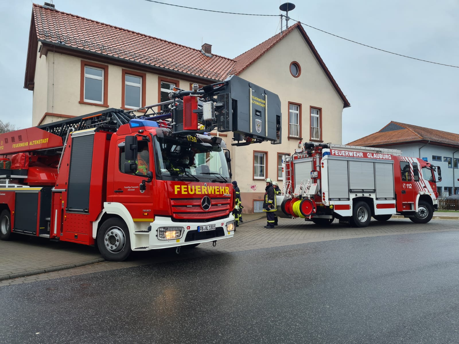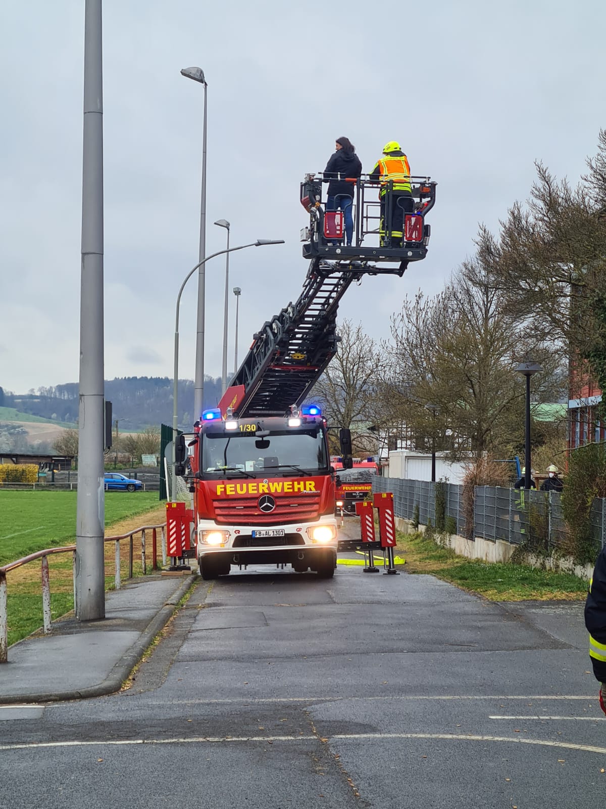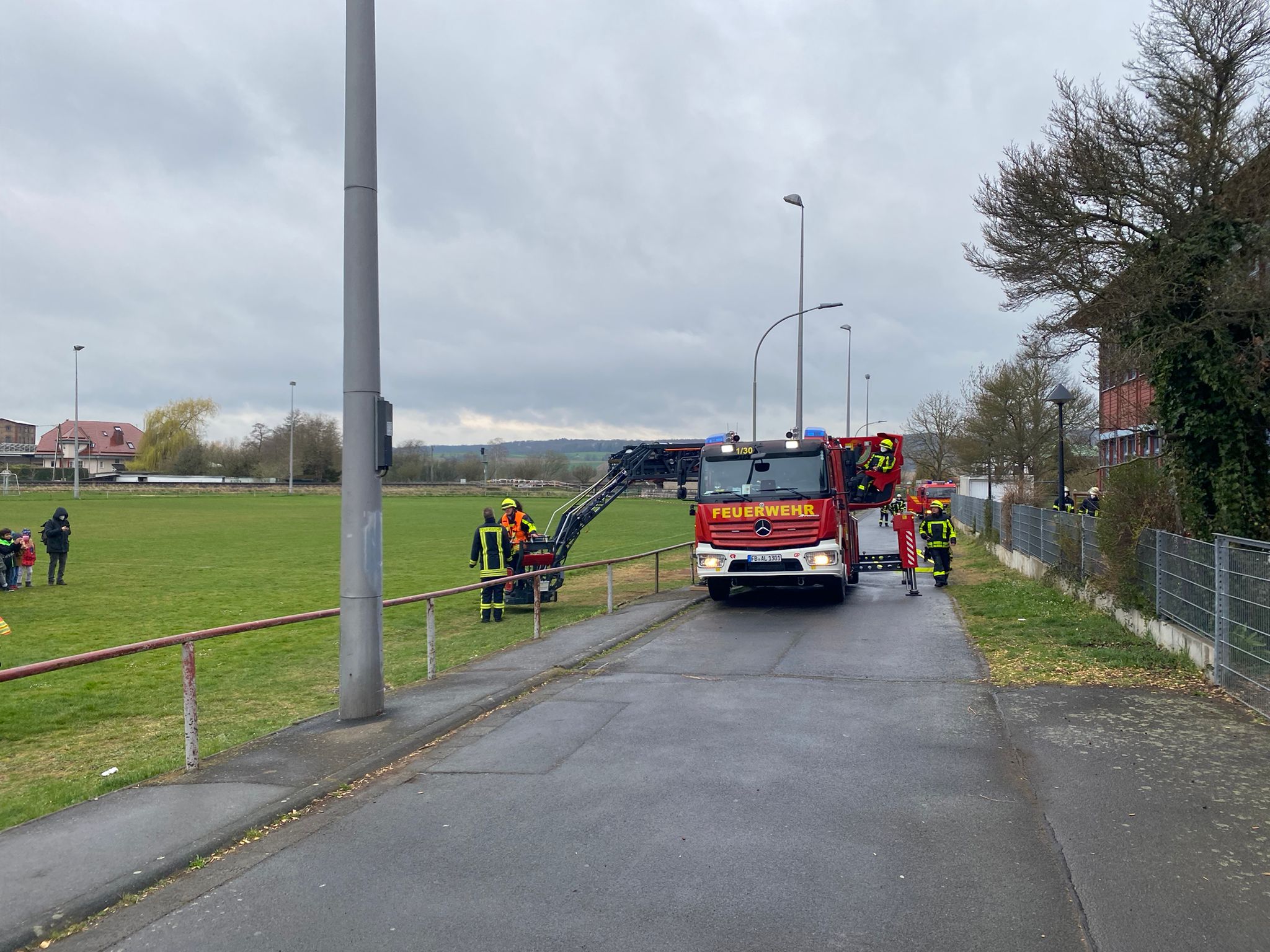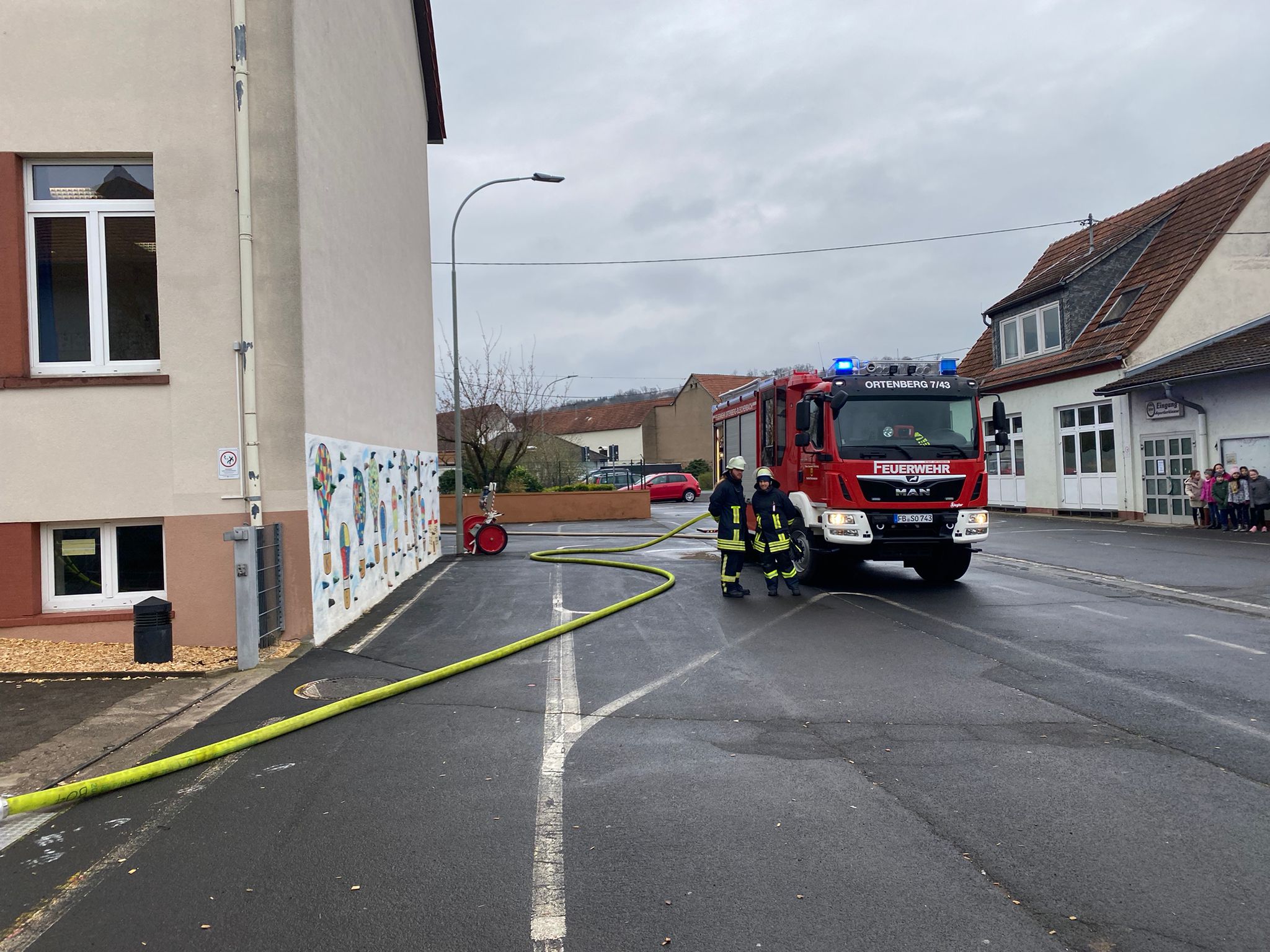 Die Kinder standen zu diesem Zeitpunkt schon alle auf dem Hof der Grundschule und "warteten" auf die Feuerwehr. Die Fahrzeuge der Feuerwehren aus Stockheim, Glauberg, Bleichenbach und Altenstadt positionierten sich rund um die Schule und nahmen einen Löschangriff vor. Eine Lehrerin wurde mit der Drehleiter aus dem 1. OG gerettet. Die Kinder waren sichtlich neugierig was alles passierte.