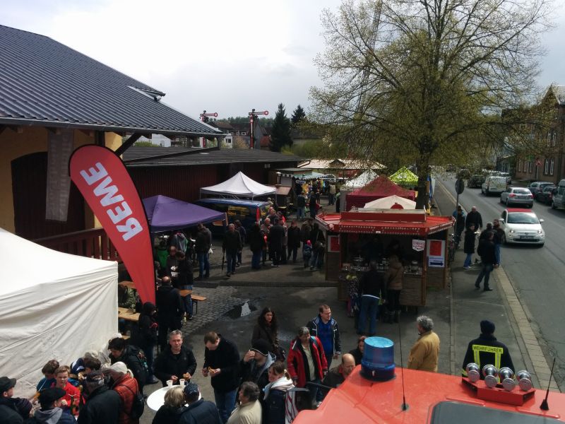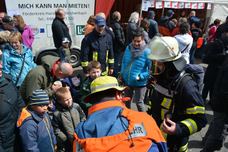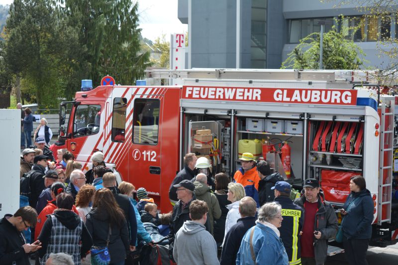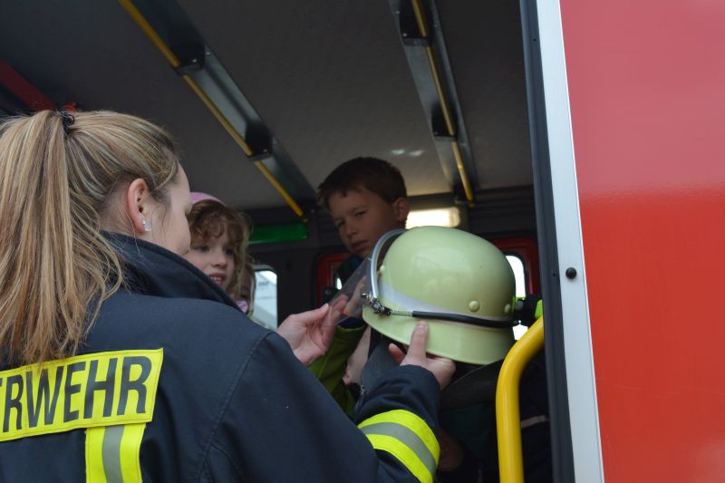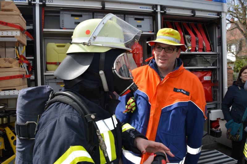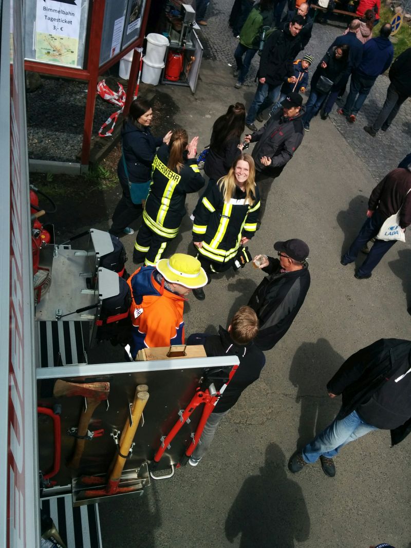 Gleichzeitig wurde das HLF auf dem Fest direkt am Bahnhof für die vielen Besucher ausgestellt. Diese nutzten das Angebot auch reichlich. Kinder saßen schon mal Probe in der Mannschaftskabine und bekamen so einiges erklärt. Highlight war aber der Atemschutzgeräteträger. Nicht oft sieht man diese komplett ausgerüstet in der Öffentlichkeit. Die ersten Berührungsängste konnten schnell überwunden werden. Die Kameraden erklärten aber auch den älteren Besuchern die Technik und beantworteten jede Frage zum Thema "Feuerwehr".