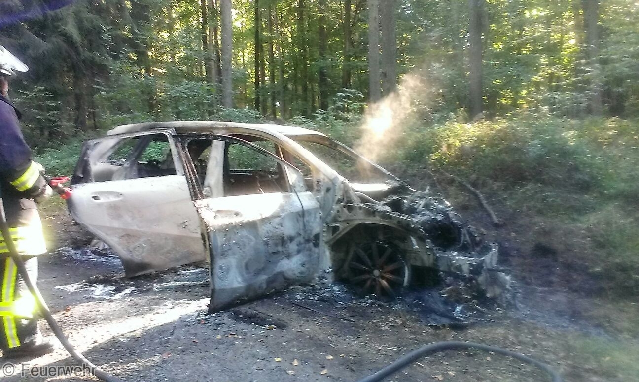 Da der PKW in dem zunächst vermuteten Waldweg nicht zu finden war, teilten sich die Kräfte der Feuerwehr und Polizei zur Suche auf. In einem Waldweg konnte schließlich durch die HLF-Besatzung ein PKW entdeckt werden, der ganz offensichtlich bereits in der vergangenen Nacht gebrannt hatte. Da noch eine Rauchentwicklung erkennbar war, wurde durch die Feuerwehr für Nachlöscharbeiten noch ein S-Rohr vorgenommen.