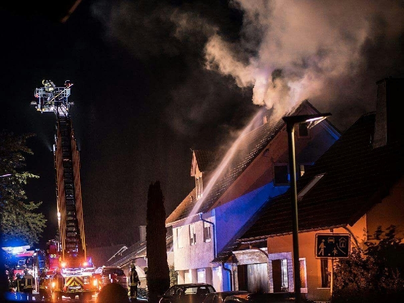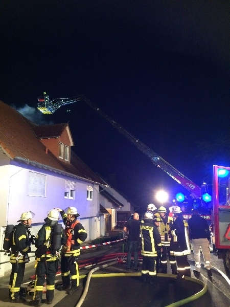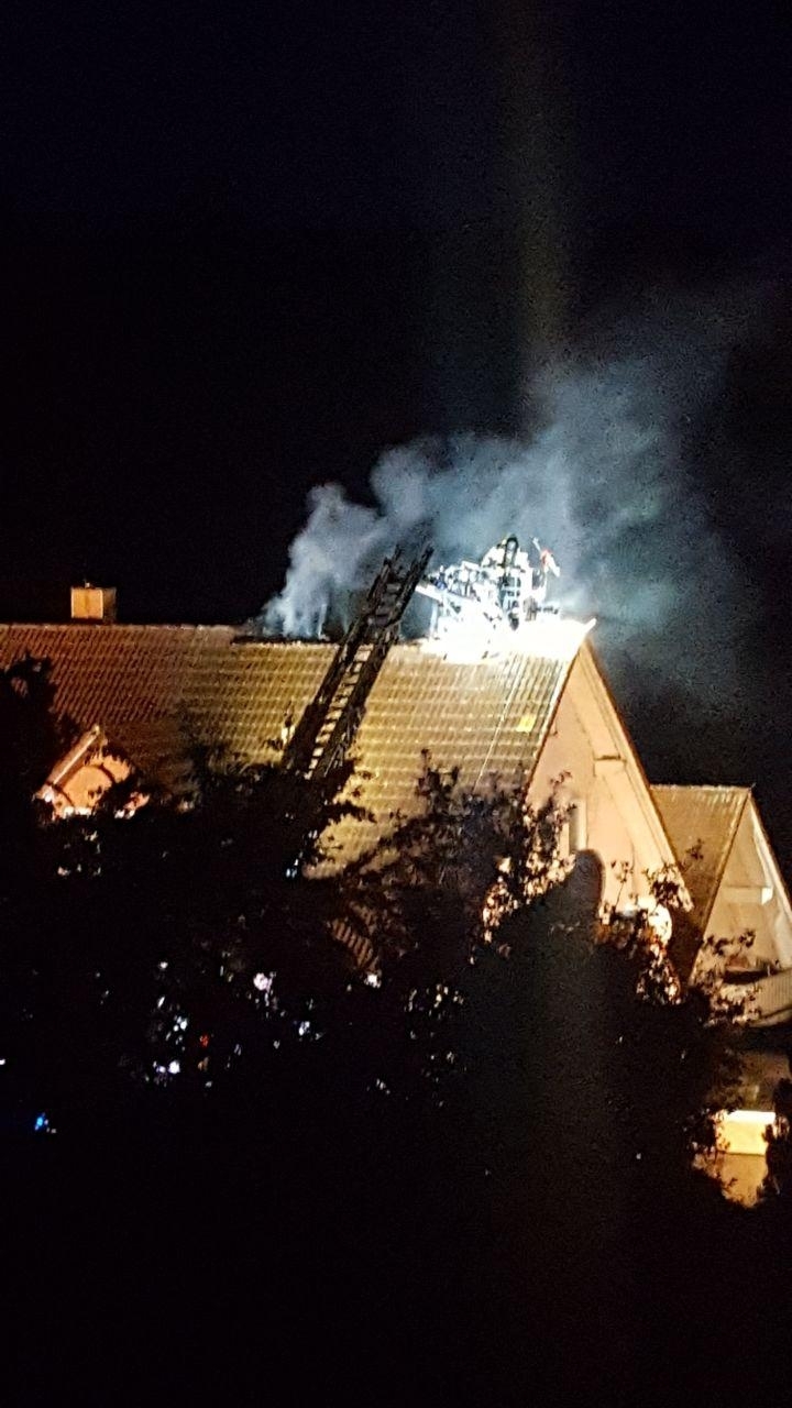 Die ersten Einsatzkräfte konnten die Meldung nach dem Eintreffen bestätigen. Die Dacheindeckung war auf einer Fläche von ca. 15m² bereits durchgebrannt. Da von den vor Ort Anwesenden zunächst keine klare Aussage zu bekommen war, ob sich noch Personen im Gebäude befinden, wurden alle Wohnungen von 3 Trupps unter Atemschutz durchsucht. Dafür musste teilweise auch Wohnungstüren gewaltsam geöffnet werden. Glücklicherweise wurden keine weiteren Personen im Gebäude vorgefunden.