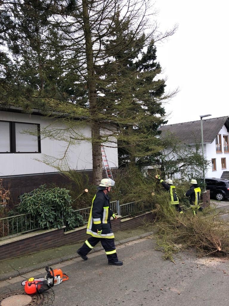 Am Samstag, dem 20. Januar 2018 erfolgte von Anwohner im Finkenweg der Hinweis an das Ordnungsamt der Gemeinde Glauburg, dass auf einem unbewohnten Grundstück ein Baum auf den öffentlichen Verkehrsraum umzustürzen drohte. Ganz offensichtlich war die Lage noch eine Nachwirkung vom Sturm am vorausgegangenen Donnerstag. Nach Rücksprache zwischen dem Grundstückseigentümer und dem Ordnungsamt wurde eine Gefahrenlage festgestellt und die Feuerwehr beauftragt, diese zu beseitigen.