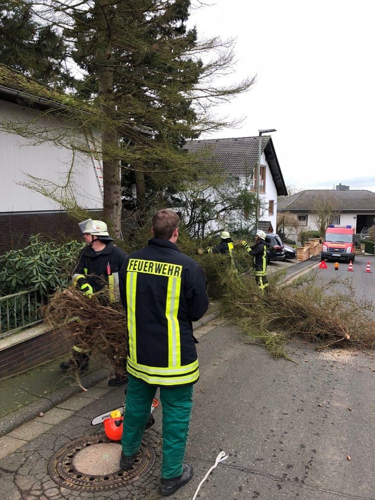 Vor Ort wurde von den Feuerwehr festgestellt, dass ein Baum mit einer Höhe von ca. 8m schräg stand und nur noch im Astwerk von einem Nachbarbaum hing. Dieser Baum wurde fixiert und mittels Muskelkraft umgezogen und auf der Straße mit Hilfe einer Motorkettensäge zerkleinert. Ein zweiter Baum mit einer Höhe von ebenfalls ca. 8m war im Stammbereich angebrochen. Auch dieser wurde mit Leine fixiert und am Stamm abgetrennt und zerkleinert. Der Baumschnitt wurde auf dem betreffenden Grundstück abgelegt.