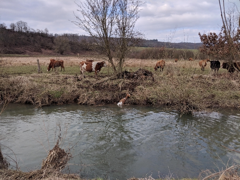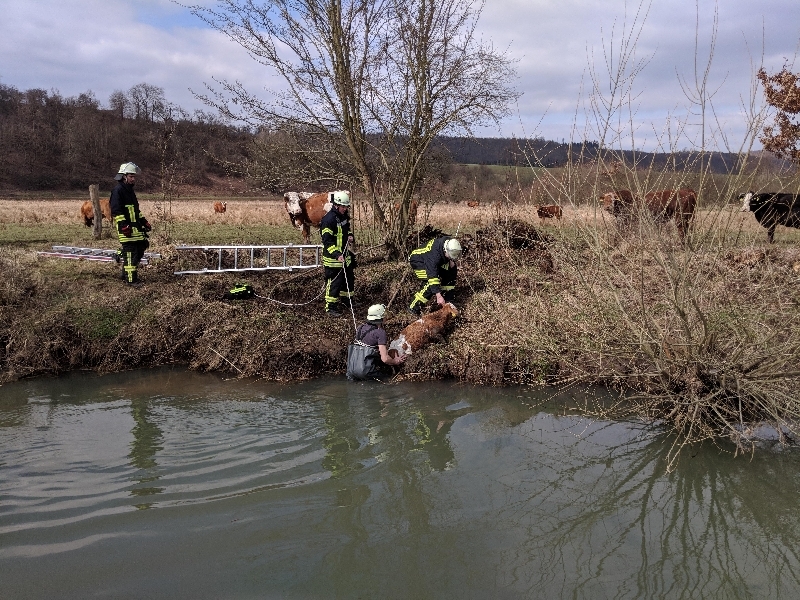Die gemeldete Lage bestätigte sich nach Eintreffen der Feuerwehrkräfte. Um das Tier besser erreichen zu können, wurde das TSF auf die andere Bachseite dirigiert. Von dort machten sich mehrere Kameraden mit Watthose und Steckleitern ausgerüstet auf dem Weg zu dem Tier. Wenige Minuten später konnte das Tier mit Muskelkraft aus seiner misslichen Lage unverletzt befreit werden und kehrte glücklich zu den schon wartenden Artgenossen zurück.