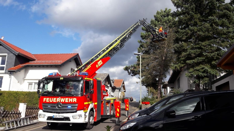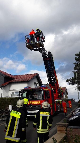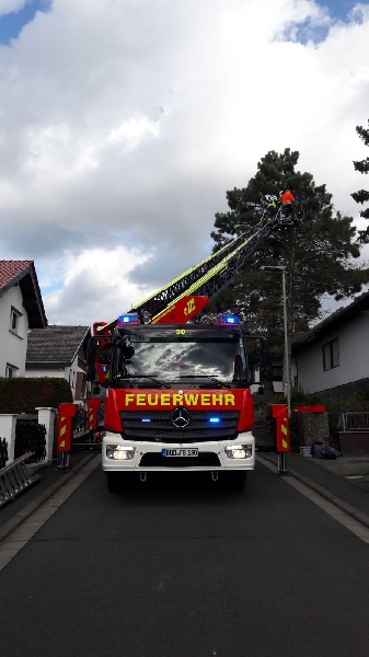 Der Wehrführer machte sich vor Ort ein Bild über die Situation und stufte die Gefahr für Menschen und einem Gebäude als hoch ein. Da die Situation mit den Möglichkeiten der Feuerwehr Stockheim nicht gelöst werden konnte, wurde neben der Feuerwehr Stockheim auch die Feuerwehr Büdingen mit der Drehleiter nachgefordert. Mit Hilfe der Drehleiter wurde der Baum dann Stück für Stück kontrolliert zurückgenommen.