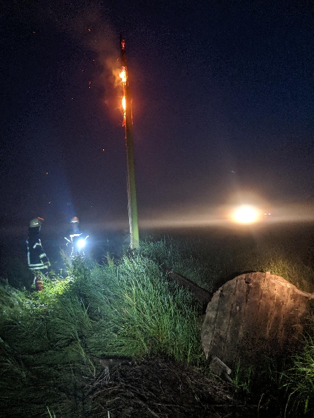 Bedingt durch die voranschreitende Dunkelheit wurde der Feuerschein größer und lockte sichtbar viele Autofahrer an. Um zu verhindern, dass eine Alarmierung in der tiefen Nacht erfolgt, wurde entschieden, den Mast abzulöschen. Der erste Plan, den Mast mittels Motorsäge zu fällen und in der feuchten Wiese abzulegen musste verworfen werden, da der Mast durch den vorangegangene Blitzeinschlag sehr instabil war und die Sägearbeiten nur mit Gefährdung der Einsatzkräfte hätten erfolgen können.