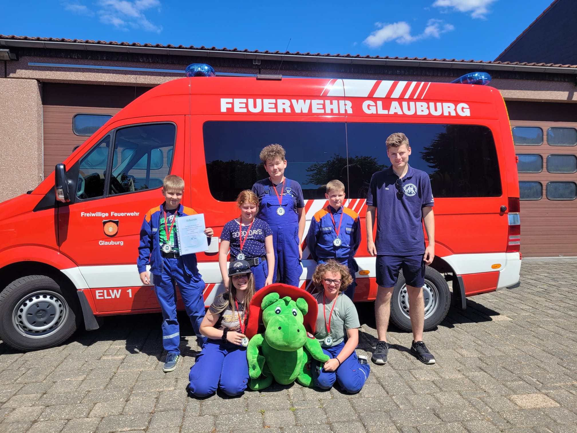 Am Ende erreichten wir bei den Jugendfeuerwehren den siebten Platz. Mit Medaillen für die Jugendlichen und einer großen Packung Gummibärchen machten wir uns schließlich auf den Heimweg, wo noch das Gruppenfoto mit dem Feuerwehrdrachen „Grisu“ anstand.