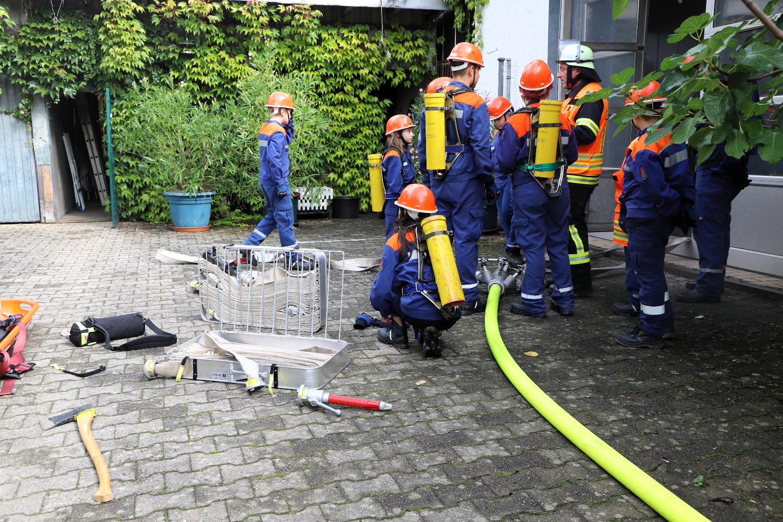 Dieser sollte sich schnell bewährt machen. Im nächsten Einsatz galt es, einen simulierten Herzinfarkt zu erkennen und zu behandeln. Am späten Nachmittag folgte eine Dienstsporteinheit sowie ein weiterer theoretischer Unterricht, bevor die Kinder gegen 17.20 Uhr vor ihrer größten Herausforderung des Tages standen. Im Glauberger Gewerbegebiet war ein Brand in einer Firmenhalle gemeldet worden, auch das Drehleiterfahrzeug der Feuerwehr Altenstadt wurde alarmiert.