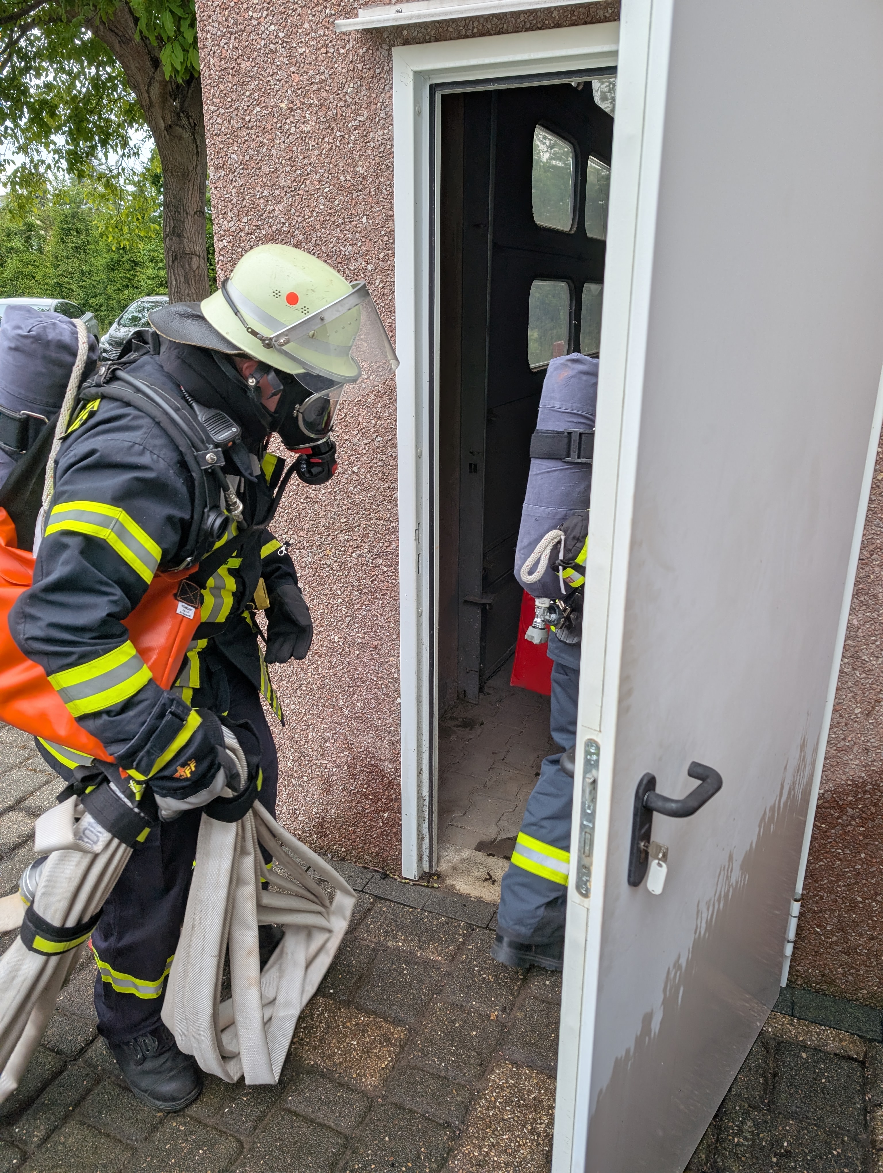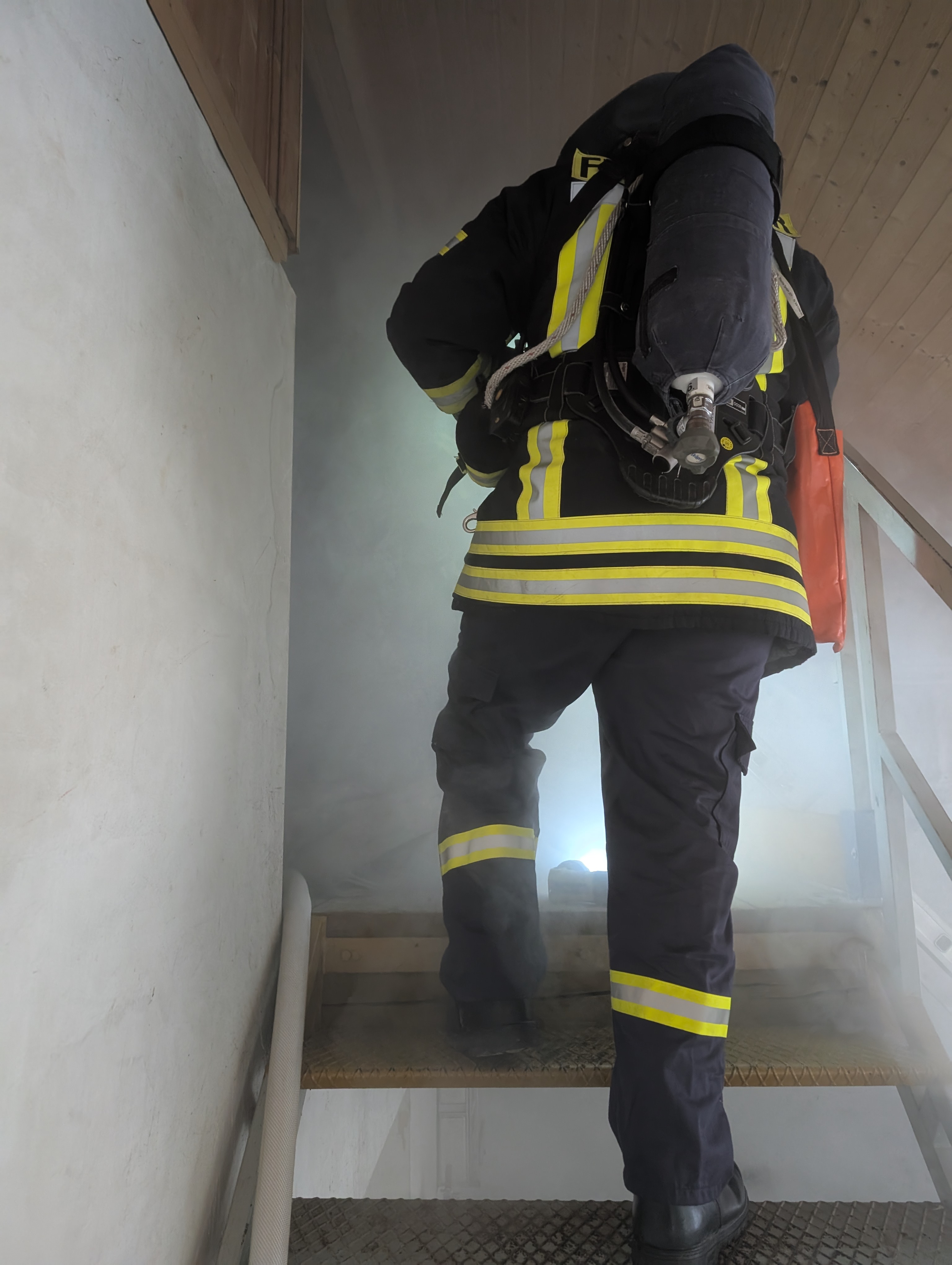 Im zweiten Teil des Tages ging es um das Szenario eines Brandeinsatzes mit Innenangriff. Im Mittelpunkt stand das sogenannte Schlauchmanagement – also der richtige Umgang mit Schläuchen im Gebäude – sowie die grundlegenden Tätigkeiten, die jeder Feuerwehrmann und jede Feuerwehrfrau beherrschen muss. Hier zeigte sich: Übung macht den Meister, und nur durch regelmäßiges Training kann im Ernstfall schnell und sicher gehandelt werden.